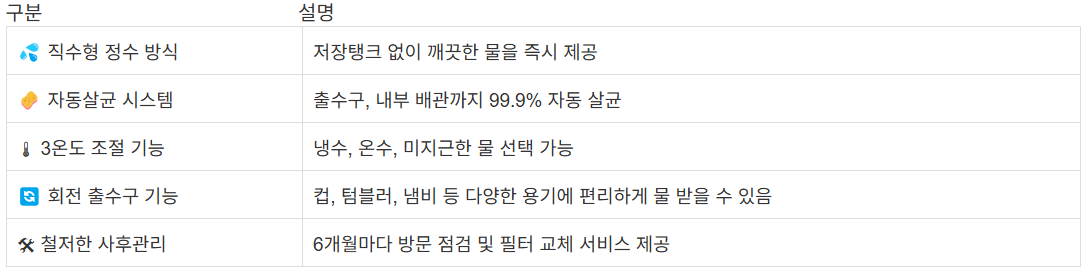 LG 퓨리케어는 "깔끔한 디자인 + 첨단 기술 + 직수 시스템"을 모두 갖춘 프리미엄 정수기 브랜드이며 직수형 정수기로 항상 신선한 물 제공 무관수 시스템(탱크 없음)으로 위생 걱정 최소화에 자동살균, 스마트 기능 강화 또 특히, 위생에 민감한 소비자들과 신혼부부, 가족 단위 사용자들에게 인기가 높습니다.