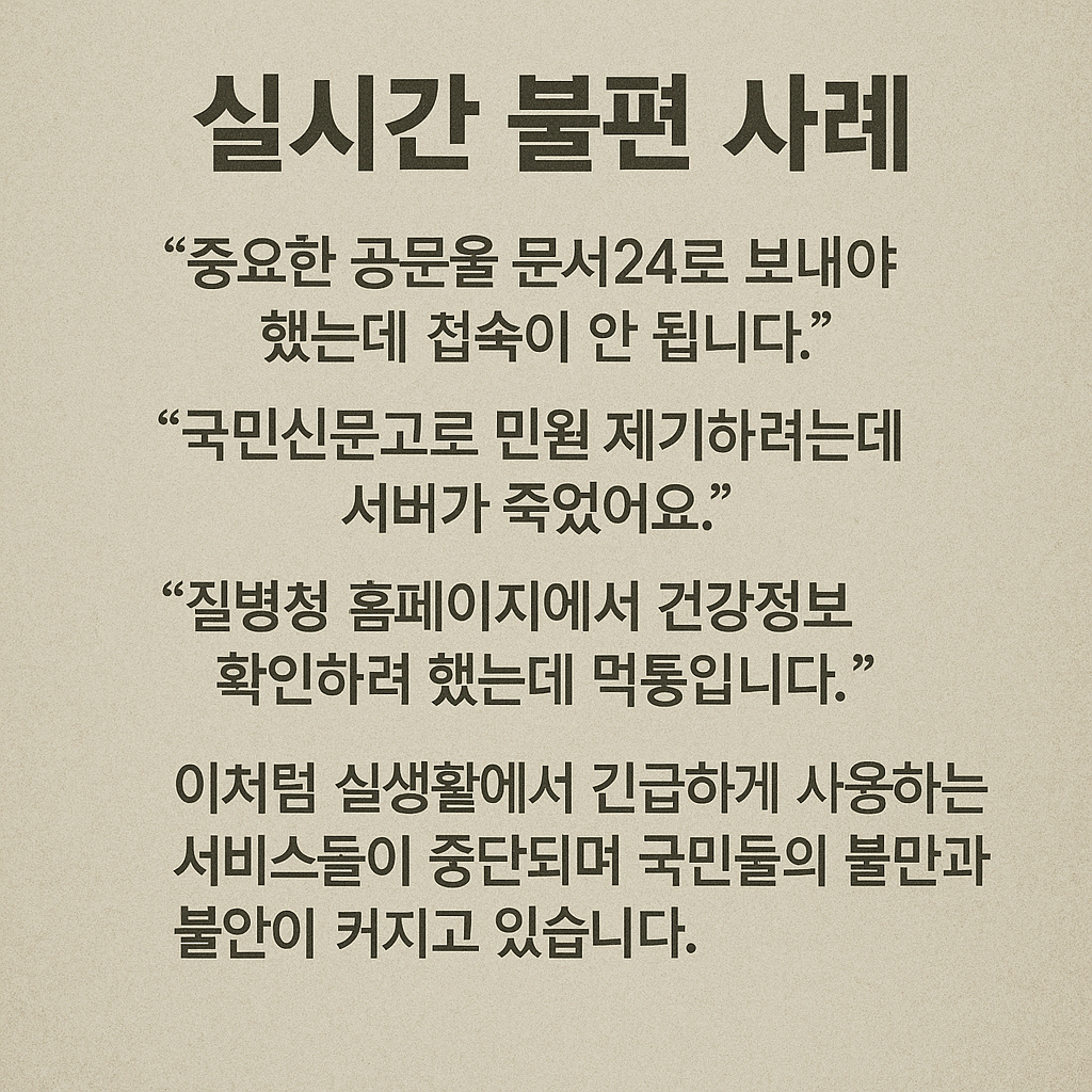 이번 정부 시스템 마비 사태는 단순한 기술 문제가 아니라, 국민 신뢰와 직결된 문제입니다. 정부는 조속히 문제를 해결하고, 재발 방지 대책을 마련해야 할 것입니다.