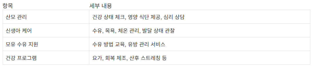 일반 민간 조리원과 유사한 서비스 제공에 가격 부담은 대폭 줄어든다는 것을 확인하시기 바랍니다.